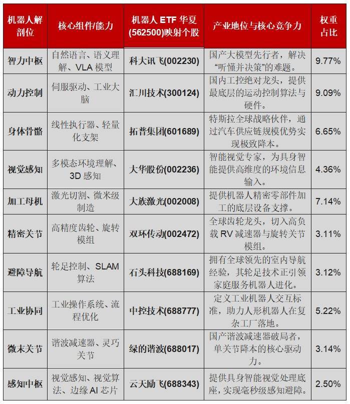 随着人形机器人进入“1-10”的量产爬坡期,板块波动加剧,寻找具有护城河的确定性标的成为投资关键。机器人ETF华夏(562500)凭借其全产业链覆盖的特性,成为了布局这一赛道的首选锚点。为了让投资者更清晰地理解,我们将机器人ETF华夏(562500)的前十大成分股与其在机器人体内的功能部位进行一一对应: