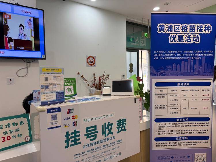 4月24日,记者在上海黄浦区打浦桥街道社区卫生服务中心接种门诊看到,挂号收费处张贴了“黄浦区疫苗接种优惠活动”的海报,其中显示九价HPV疫苗的接种年龄、接种剂次以及惠民费用等信息,惠民政策要求首针在2026年9月30日前完成,全程接种需在2027年3月31日前结束。同时,该社区也提供免费双价HPV疫苗的接种服务。
